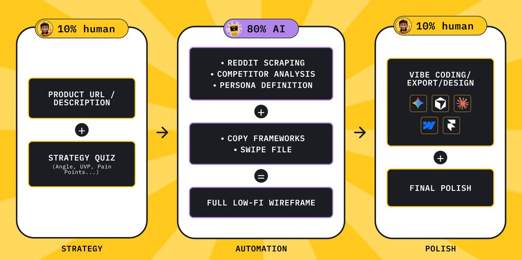 Avec Aymeric, nous avons construit Lutains pour automatiser ces fameux 80% d’exécution. C’est un workflow né de notre propre douleur : après un premier lancement raté (1 seul inscrit à la waiting list…), nous nous sommes formés au copywriting, au design et au neuromarketing pour créer l’outil qui nous manquait.